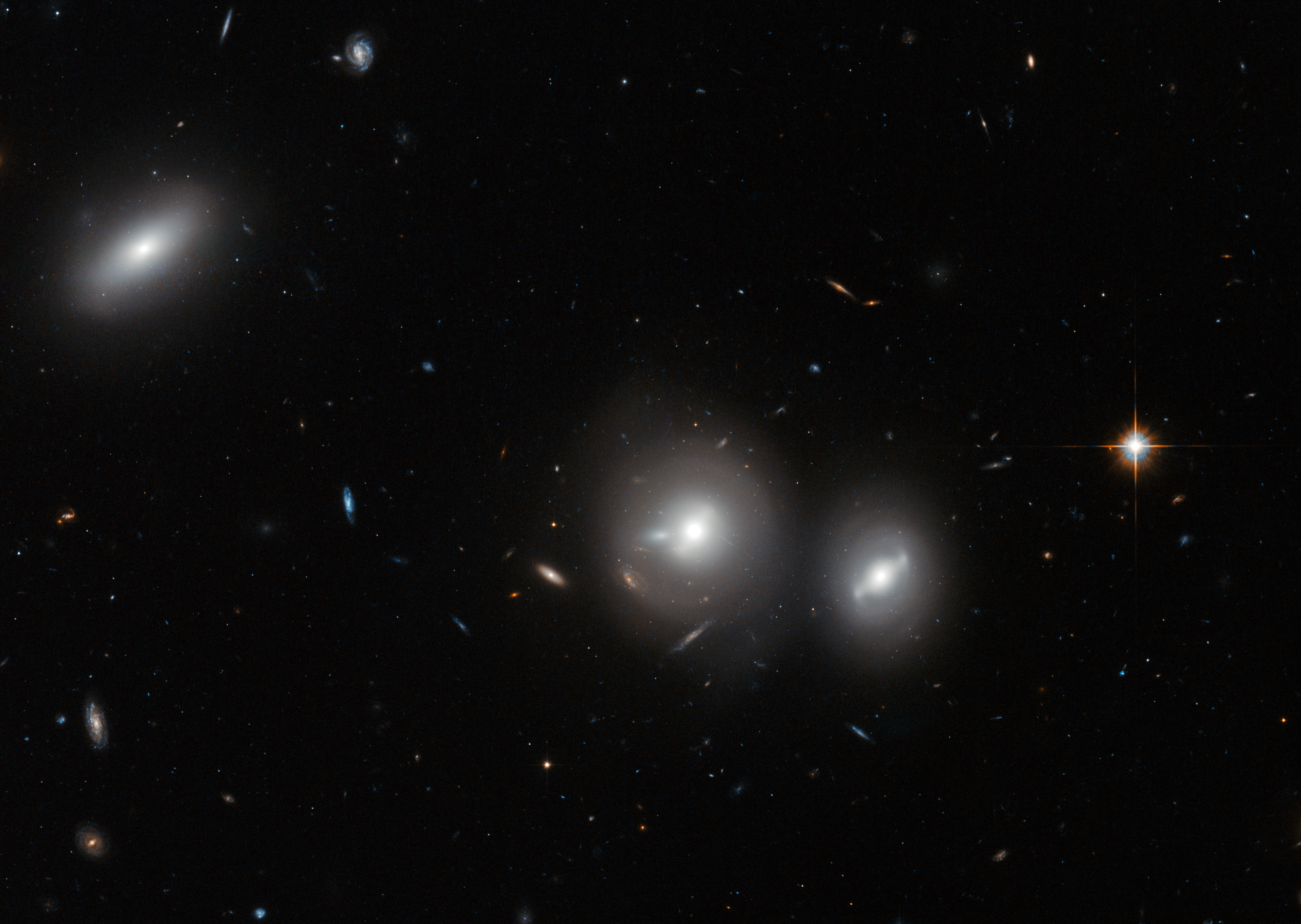 In this new image Hubble peeks into the Coma Cluster, a massive gathering of galaxies located towards the constellation of Coma Berenices. This large cluster is around 350 million light-years away from us and contains over 1000 identified galaxies, the majority of which are elliptical. The bright, saucer-shaped objects surrounded by misty halos in this image are galaxies, each of them host to many millions of stars. The background of the image is full of distant galaxies, many of them with spiral shapes, that are located much further away and do not belong to the cluster.